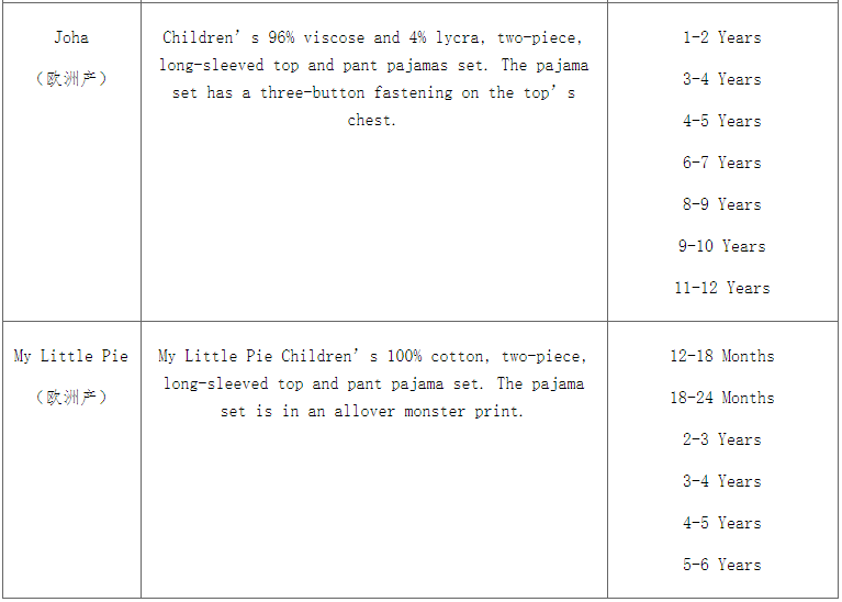 此次召回產(chǎn)品為5款兒童睡衣。具體召回產(chǎn)品信息如下: