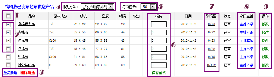 8、今日主推,在坯布現(xiàn)貨及其他相關(guān)欄目中主推的產(chǎn)品,“主推”或“取消主推”;
