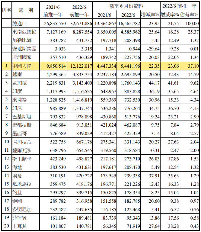 注:依2022年6月前推一年進(jìn)口占有率排序