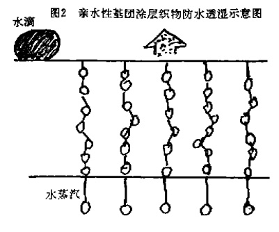 此法先制成一個微孔性的薄膜,然后與織物復(fù)合。聚四氟乙烯微孔薄膜是用特殊加工方法制得的。先臺成高結(jié)晶的顆粒,而后在390—400℃的高溫條件下,縱橫雙向同時給于均勻一致的拉力,迅速拉伸成薄膜。厚度為20—25m,微孔直徑大為0.2u,孔徑密度達13.95億個/厘米。聚氨酯微孔結(jié)構(gòu)薄膜也用上述相似原理制造,其微孔直徑為0_u,孔徑密度約1.55億個/厘米t。本方法適合于復(fù)合涂層的薄膜復(fù)貼在紡織品。其透濕性取決于薄膜的質(zhì)量具有高透濕、高防水性能t但制造薄膜的技術(shù)難度相當(dāng)高,成本昂貴。4高親水基團的化學(xué)透濕法這是一種非微孔性的薄膜材料。這種透濕水滴圈2親水性基團涂層織物防水透濕示意圖涂層的關(guān)鍵特征是在聚氨酯大分子結(jié)構(gòu)中含有足夠量的高親水基,作為水蒸汽移動的階梯。水蒸汽通過吸收、擴散、解吸等物理作用透過薄膜。