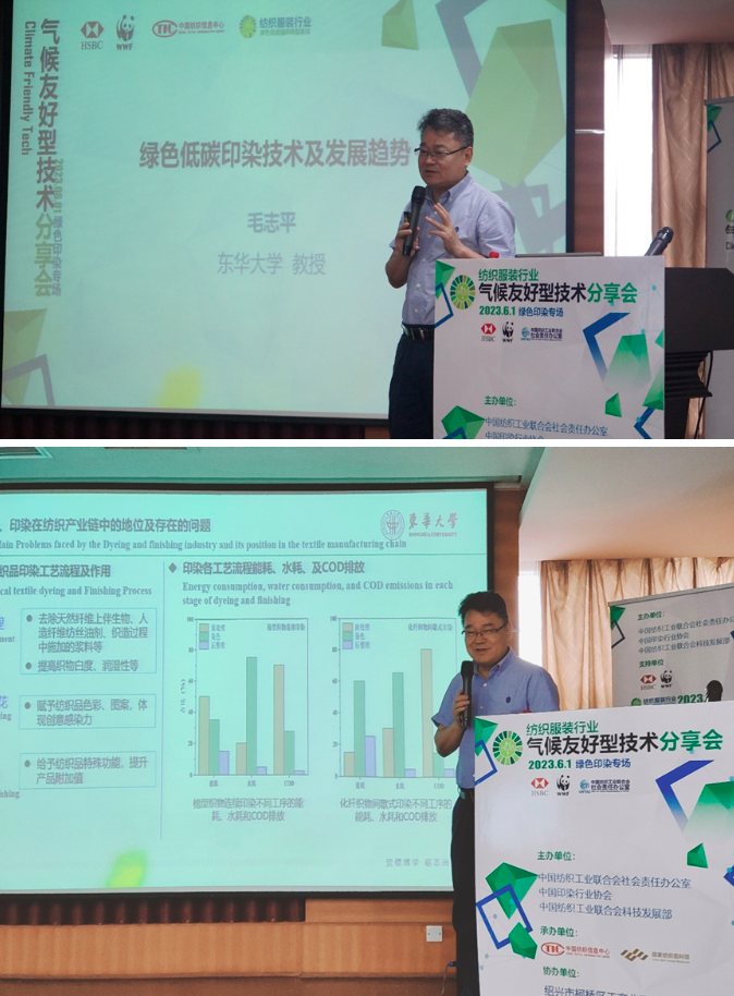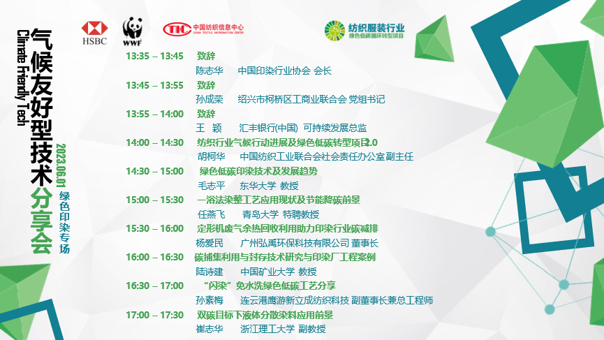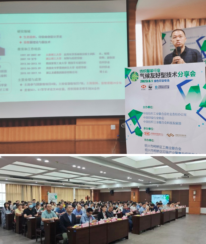 2023年6月1日,紡織服裝行業(yè)氣候友好型技術(shù)分享會(huì)[綠色印染專場(chǎng)]在紹興市柯橋區(qū)順利舉辦。此次技術(shù)分享會(huì)由中國(guó)紡織工業(yè)聯(lián)合會(huì)社會(huì)責(zé)任辦公室、中國(guó)印染行業(yè)協(xié)會(huì)和中國(guó)紡織工業(yè)聯(lián)合會(huì)科技發(fā)展部主辦,中國(guó)紡織信息中心和國(guó)家紡織面料館承辦。為推動(dòng)綠色低碳紡織產(chǎn)業(yè)發(fā)展、促進(jìn)產(chǎn)業(yè)綠色清潔化轉(zhuǎn)型提供科技支撐,HSBC匯豐銀行和WWF世界自然基金會(huì)為本次活動(dòng)提供支持。