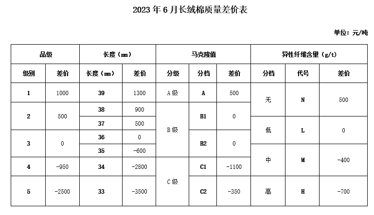 根據(jù)《中國棉花協(xié)會國產(chǎn)棉質(zhì)量差價(jià)表管理辦法》規(guī)定,現(xiàn)正式發(fā)布2023年6月《鋸齒加工細(xì)絨棉質(zhì)量差價(jià)表》、《皮輥加工細(xì)絨棉質(zhì)量差價(jià)表》和《長絨棉質(zhì)量差價(jià)表》(單位:元/噸)。