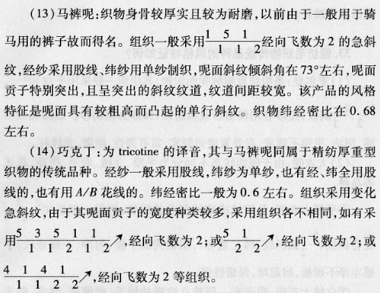 (2)華達呢:又名軋別丁(gabardine),由于華達呢常采納阻水后整理,用作晴雨大衣呢布料,所以都是譯名。過去商業(yè)上習(xí)慣以線經(jīng)、紗緯的稱為華達呢,線經(jīng)、線緯的稱為軋別丁。組織一般為2/2右斜,斜紋是角度為62°-63°的急斜紋。呢面上具有清楚凸起的以經(jīng)紗為主體的粗條紋的斜紋貢子。其緯經(jīng)比在0.50~0.52左右。華達呢有中厚型、中薄型及厚重型三種規(guī)格。中厚型華達呢,簡稱華達呢,要求呢面紋路粗而直,經(jīng)緯紗結(jié)構(gòu)緊密,身骨厚實,是華達呢品類中的代表品種。中薄型華達呢,又稱單面華達呢,組織為2/1右斜,呢面呈現(xiàn)細密清楚的急斜紋,身骨堅實、細沽,由于是2/1右斜組織,織物反面為不明顯的緯面斜紋,這是單面華達呢的由來。產(chǎn)品重量較輕,織物細潔雅致,懸垂性好。厚重型華達呢又稱緞背華達呢,組織為緞背組織(加強緞紋的一種),織物正面近似2/急斜紋,反面為經(jīng)緞紋組織,類似雙層組織。其斜紋傾斜角為56°一57°,緯經(jīng)密比為0.45-0.50,織物身骨飽滿,保暖性好。