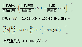 參照以上同類別成品每平方米重量計算公式.如果經(jīng)緯向是線,由于捻縮的原因,成品每平方米重量偏重,大約增重1%。氣流紡紗因為配棉較差,短纖維較多,通過印染退漿、絲完工序纖維損失率較大,所以紗系數(shù)用24或24.3*0.95,此系數(shù)為經(jīng)驗公式,對于32S以上的紗線支數(shù)較為精確。本色棉布每平方米重量計算