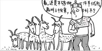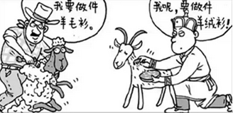 看了這組漫畫,你明白了吧,羊毛長在綿羊身上,而只有山羊身上才有羊絨。收集羊毛就像剪發(fā),用剪刀全部剃下就可以,每只綿羊每年可產(chǎn)幾公斤羊毛;而羊絨長在山羊粗毛的根部,收集羊絨時要用特制的鐵梳子一點一點梳下來,每只山羊身上只能收獲幾十克。