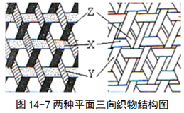 是以兩根相交角度為60°的經(jīng)紗和一根緯紗交錯(cuò)而成。