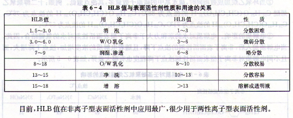 表面活性劑的HLB值的應(yīng)用,和表面活性劑的性質(zhì)有著緊密的聯(lián)系,然而,迄今為止,確定HLB值的方法還比較粗略,還不能單純由HLB值來確定表面活性劑的性質(zhì),因而,不能將HLB值作為挑選表面活性劑的主要條件,但HLB值可援助我們大體上了解表面活性劑的性質(zhì),有助于初步選擇。在助劑的復(fù)配中可考慮其HLB值應(yīng)基本相同。HLB值和表面活性劑性質(zhì)和用途之間的關(guān)系見表6-4。