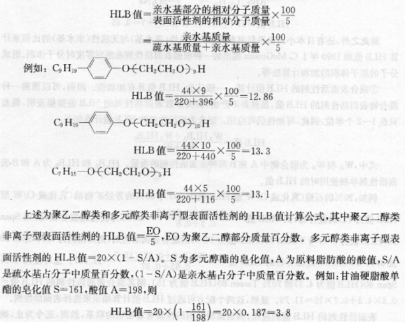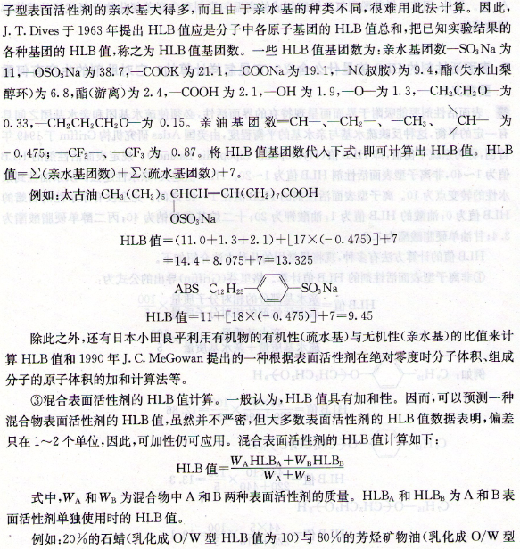 ?、陔x子型表面活性劑的HLB值計(jì)算。對(duì)于陰離子型表面活性劑和陽離子型表面活性劑就不能用以上計(jì)算方法,因?yàn)殛帯㈥栯x子型表面活性劑的親水基的親水性,其單位質(zhì)量要比非離