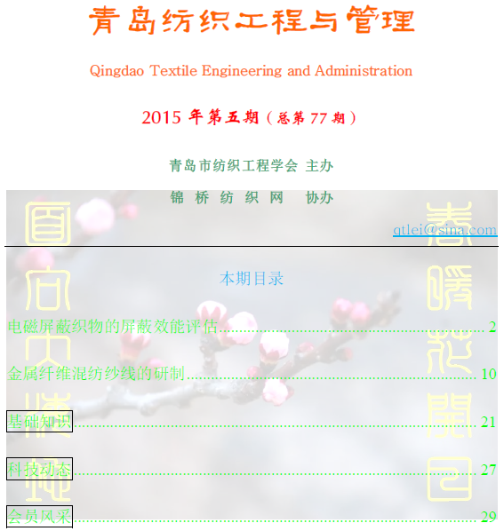 由青島市面料工程學會主辦、面料網(wǎng)協(xié)辦的《青島布料工程和治理》電子期刊于2009年1月正式創(chuàng)刊。該刊由青島市面料工程學會秦志強工程師任主編。該刊除以電子郵件形式發(fā)送至會員單位外,還在布料網(wǎng)開設(shè)特意窗口供業(yè)內(nèi)人士進行掃瞄和查閱。該刊的創(chuàng)辦定能為廣大布料業(yè)技術(shù)人員提供1個技術(shù)交流平臺,為我國面料業(yè)技術(shù)創(chuàng)新起到積極作用。