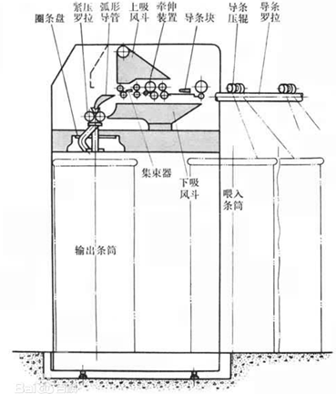 并條機由喂入、牽伸和成型卷繞三個部分組成。棉型并條機的工作過程如下:喂入條筒中引出的條子經(jīng)過導(dǎo)條板和導(dǎo)條羅拉及導(dǎo)條柱后在導(dǎo)條臺上并列向前輸送,進入牽伸裝置。牽伸后的纖維網(wǎng)經(jīng)集束器初步收攏后由集束羅拉輸出,進入導(dǎo)條管,再經(jīng)喇叭頭凝聚成條,被緊壓羅拉壓緊后,由圈條器將纖維條有規(guī)律地圈放在機前的輸出條筒內(nèi)。