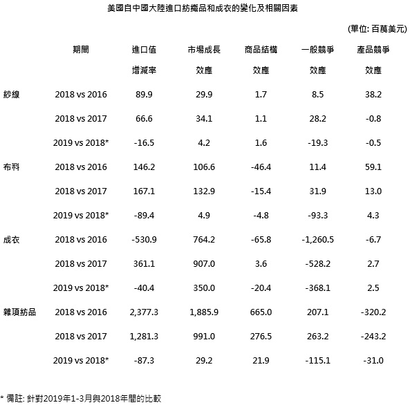 CMS模式結(jié)果顯示,即使在關(guān)稅戰(zhàn)前,中國成衣出口競爭力也在減弱當(dāng)中,這是導(dǎo)致2016-2018年期間中國輸美成衣減少5.3億美元重要的因素。同樣地,該種競爭力衰退導(dǎo)致,2019年第1季中國輸美成衣,與2018年同期相比,減少3.68億美元。