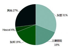 按原材料劃分,碳纖維主要有聚丙烯腈(PAN)基、瀝青基、黏膠基等幾種。PAN基碳纖維具有高強、高模、耐高溫、耐腐蝕、導電等特點。在目前使用的高強型和超高強型碳纖維中,約90%為PAN基碳纖維,總生產能力已超過4萬噸。其中,日本東麗、三菱麗陽和東邦三大集團的生產能力約占產能的75%;其次是美國企業(yè),產能約占產能的14%。