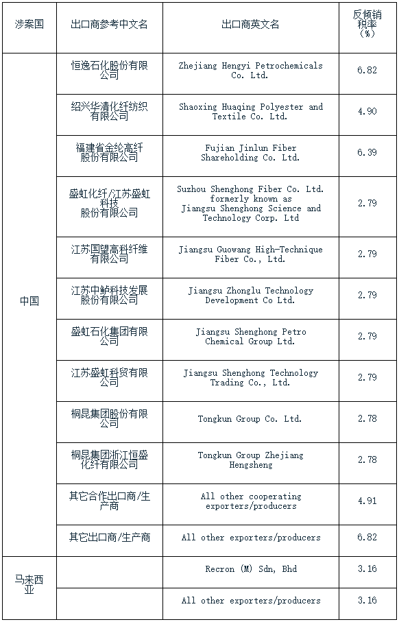 2022年1月26日,巴基斯坦國家關(guān)稅委員會發(fā)布公告稱,應(yīng)巴基斯坦上訴法庭要求,對原產(chǎn)于或進(jìn)口自中國和馬來西亞的聚酯長絲紗線(Polyester Filament Yarn)重新進(jìn)行反傾銷調(diào)查,修改原終裁結(jié)果,調(diào)整對涉案產(chǎn)品的成本加運費(C&F)反傾銷稅,調(diào)整之后,中國為2.78-.82%,馬來西亞為3.16%,稅率詳見附表,措施有效期至2022年8月25日。本案傾銷調(diào)查期為2014年10月1日~2015年9月30日,損害調(diào)查期為2012年10月1月-2015年9月30日。本案涉及巴基斯坦稅號5402.3300、5402.4700、5402.6200項下的產(chǎn)品,不包括彩色聚酯長絲紗線。