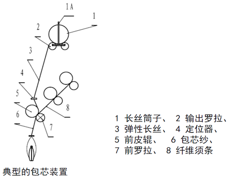 以長絲為芯,短纖維為皮的包纏結構的紗,屬貼合紗??稍诃h(huán)錠紡紗機或捻線機,轉杯紡,渦流紡,塵籠紡,自捻紡上實現。