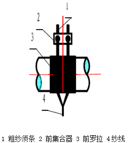 原理:將2根粗紗以肯定間距平行引入細紗機牽伸區(qū)內,同時牽伸,并在集束三角區(qū)內匯合加捻形成單紗,須條和紗均有同向捻度。