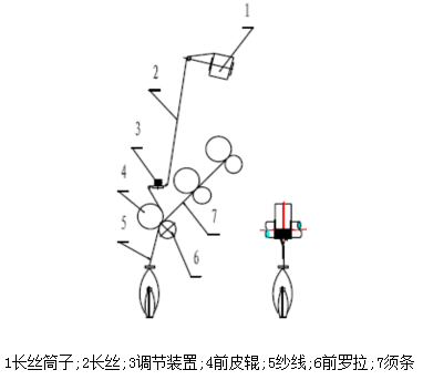 原理:由一根經牽伸后的須條和一根不經牽伸但具有肯定張力的復絲在加捻三角區(qū)層壓加捻形成的層壓紗。