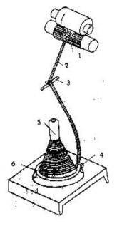 前羅拉1輸出的紗條2經(jīng)導(dǎo)紗鉤3,穿過鋼領(lǐng)6上的鋼絲圈4,繞到緊套于錠子的筒管5上。錠子回轉(zhuǎn)時,借助紗條張力的牽動,使鋼絲圈沿鋼領(lǐng)回轉(zhuǎn),且鋼絲圈帶動紗條沿鋼領(lǐng)回轉(zhuǎn)一圈紗條就獲得一個捻回。同時,因摩擦阻力等作用,鋼絲圈回轉(zhuǎn)總滯后于筒管轉(zhuǎn)速,它和筒管的轉(zhuǎn)速差使紗條卷繞到筒管上。