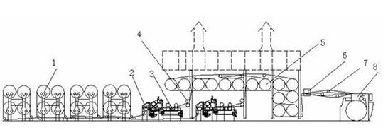 經(jīng)紗在漿紗機上進行上漿,典型的上漿工藝流程為:紡紗線從位于經(jīng)軸架1上的整經(jīng)軸中退繞出來,經(jīng)過張力自動調節(jié)裝置2,進入漿槽3上漿,濕漿紗經(jīng)濕分絞輥4分絞和烘燥裝置5烘燥后通過上蠟裝置6進行后上蠟,干燥的經(jīng)紗在干分絞區(qū)7被分別成幾層,后在車頭8卷繞成織軸。