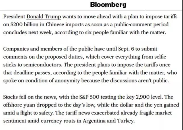 彭博援引6名知情人士的消息稱,美國總統(tǒng)唐納德·特朗普希望在下周的公共評論期結(jié)束后,盡快出臺一項計劃,對進(jìn)口自中國的2000億美元商品征收關(guān)稅。