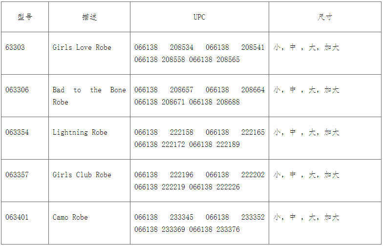 此次召回產(chǎn)品為JoeBoxer兒童羊毛長袍。具體召回產(chǎn)品信息如下: