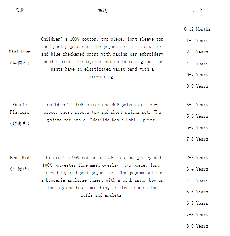 此次召回產(chǎn)品為5款兒童睡衣。具體召回產(chǎn)品信息如下: