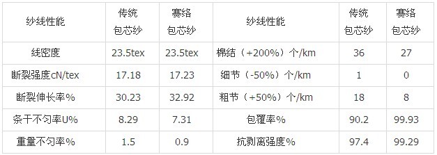 顯然,傳統(tǒng)包芯紗的包覆效果較差,質量不穩(wěn)定,賽絡紡包芯紗的各項性能指標都較好。