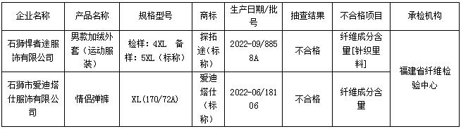 福建省運動服裝產(chǎn)品質(zhì)量省級監(jiān)督抽查結(jié)果(不合格)