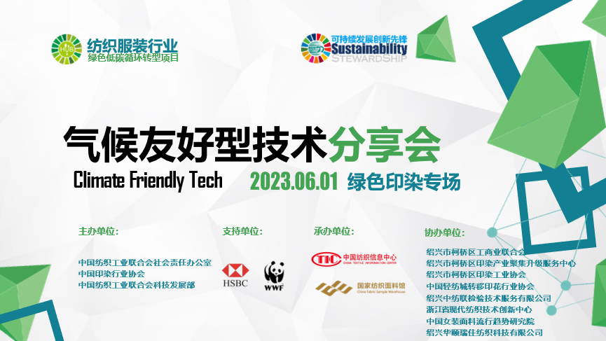 2023年6月1日,紡織服裝行業(yè)氣候友好型技術(shù)分享會(huì)[綠色印染專場(chǎng)]在紹興市柯橋區(qū)順利舉辦。此次技術(shù)分享會(huì)由中國(guó)紡織工業(yè)聯(lián)合會(huì)社會(huì)責(zé)任辦公室、中國(guó)印染行業(yè)協(xié)會(huì)和中國(guó)紡織工業(yè)聯(lián)合會(huì)科技發(fā)展部主辦,中國(guó)紡織信息中心和國(guó)家紡織面料館承辦。為推動(dòng)綠色低碳紡織產(chǎn)業(yè)發(fā)展、促進(jìn)產(chǎn)業(yè)綠色清潔化轉(zhuǎn)型提供科技支撐,HSBC匯豐銀行和WWF世界自然基金會(huì)為本次活動(dòng)提供支持。