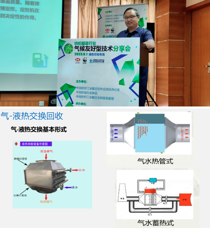 廣州弘禹環(huán)保科技有限公司董事長(zhǎng)楊愛民先生,以《定形機(jī)廢氣余熱回收利用助力印染行業(yè)碳減排》為題,講述了定形機(jī)的種類、廢氣余熱回收方式,以及余熱回收和利用的問題和定形機(jī)廢氣余熱回收裝置。他表示,定形機(jī)廢氣余熱回收和利用是符合減污降碳的要求。在一般情況下,做好定形機(jī)廢氣余熱的利用可降低企業(yè)的碳排放量3-6%。