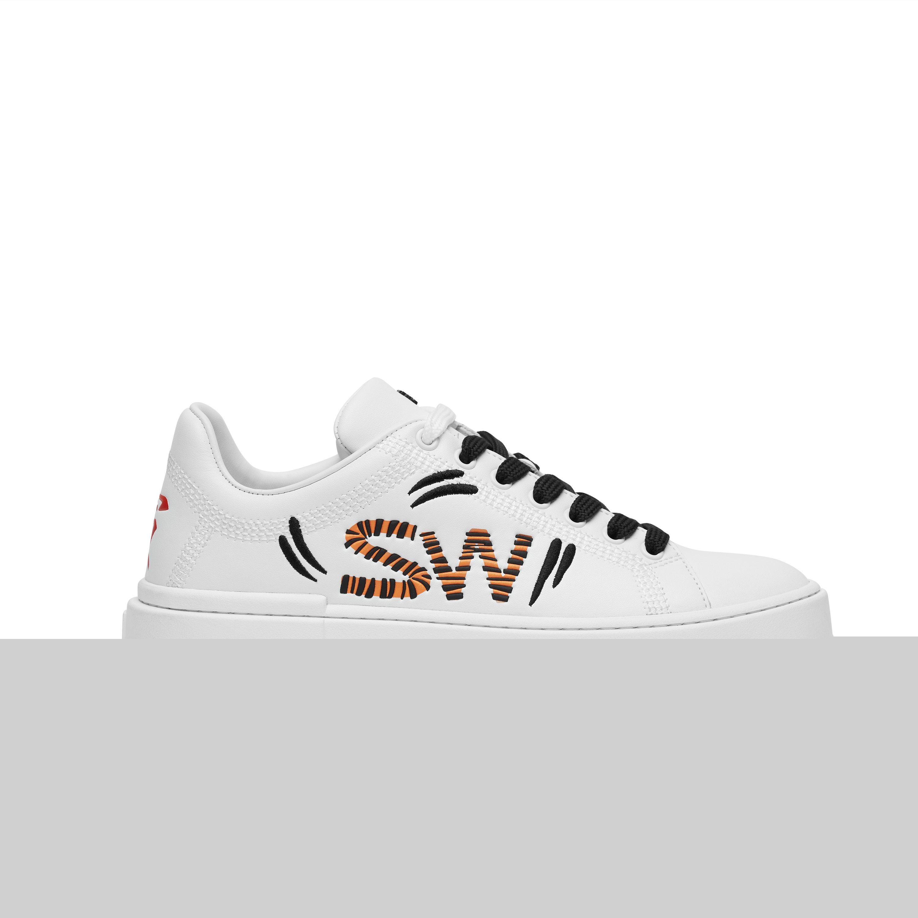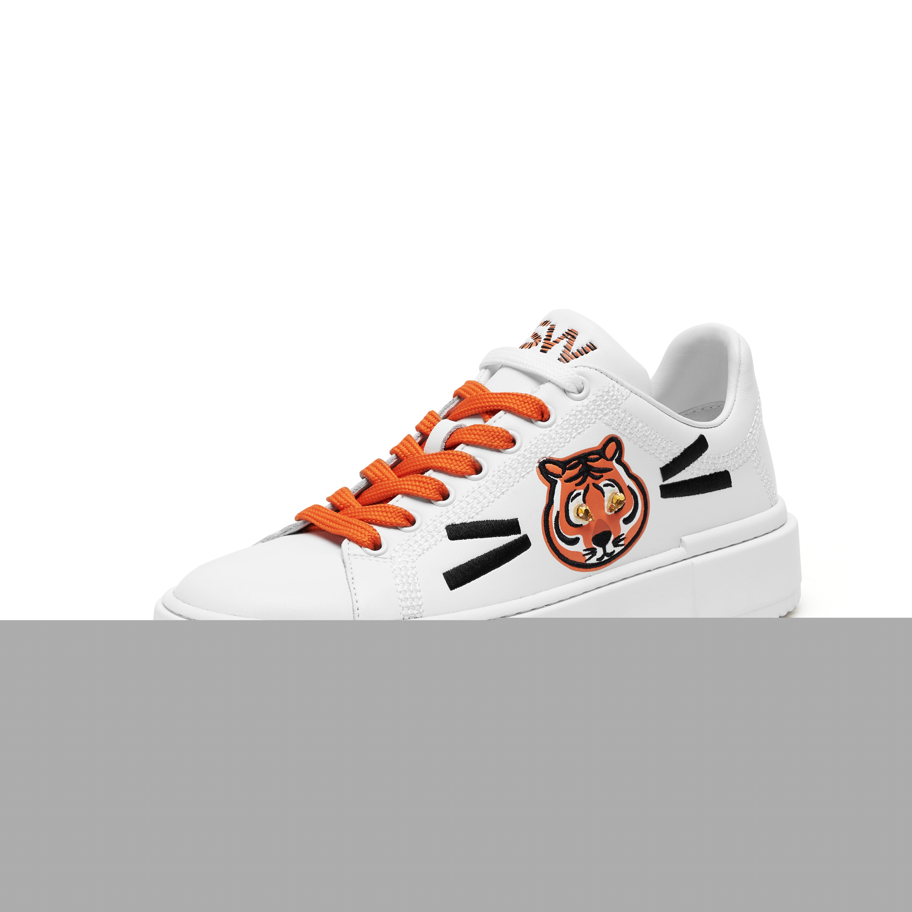 STUART WEITZMAN虎年限定膠囊系列以品牌備受歡迎的經(jīng)典鞋款RYAN LOW-TOP SNEAKER為原型重新構(gòu)建,鞋身設(shè)計(jì)靈感汲取于中國十二生肖農(nóng)歷虎年的傳統(tǒng)文化,一側(cè)飾以結(jié)合印花和刺繡工藝的萌趣老虎圖案,生動的胡須細(xì)節(jié)和水晶綴飾的老虎眼睛演繹滿滿活力與生機(jī)。另一側(cè)則印有壓紋老虎條紋的 SW 標(biāo)志,受農(nóng)歷新年啟發(fā)的漢字“寅”也鑲嵌其中,將生肖傳統(tǒng)與大膽個性完美結(jié)合,呈現(xiàn)別具一格的中國新年風(fēng)。應(yīng)景的橙黑配色給人眼前一亮的視覺沖擊張力,傳遞著生龍活虎的新姿態(tài),在活力滿滿的虎年激發(fā)更多自信和果敢,邁出虎虎生威的閃耀步伐。