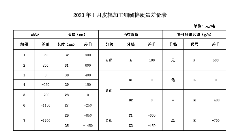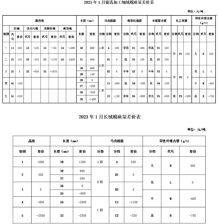 依據(jù)2022年12月的棉花公檢質(zhì)量數(shù)據(jù)、中國棉花協(xié)會(huì)棉花質(zhì)量?jī)r(jià)差自動(dòng)生成系統(tǒng)采集的棉花加工企業(yè)銷售成交價(jià)、紡織企業(yè)監(jiān)測(cè)點(diǎn)的采集數(shù)據(jù)以及當(dāng)月的中國棉花價(jià)格指數(shù),為引導(dǎo)加工期軋花廠進(jìn)行合理配車,保證加工質(zhì)量,并征求業(yè)內(nèi)專家的意見,現(xiàn)對(duì)2023年1月《中國棉花協(xié)會(huì)國產(chǎn)棉質(zhì)量差價(jià)表》做出如下調(diào)整: