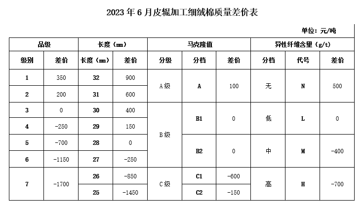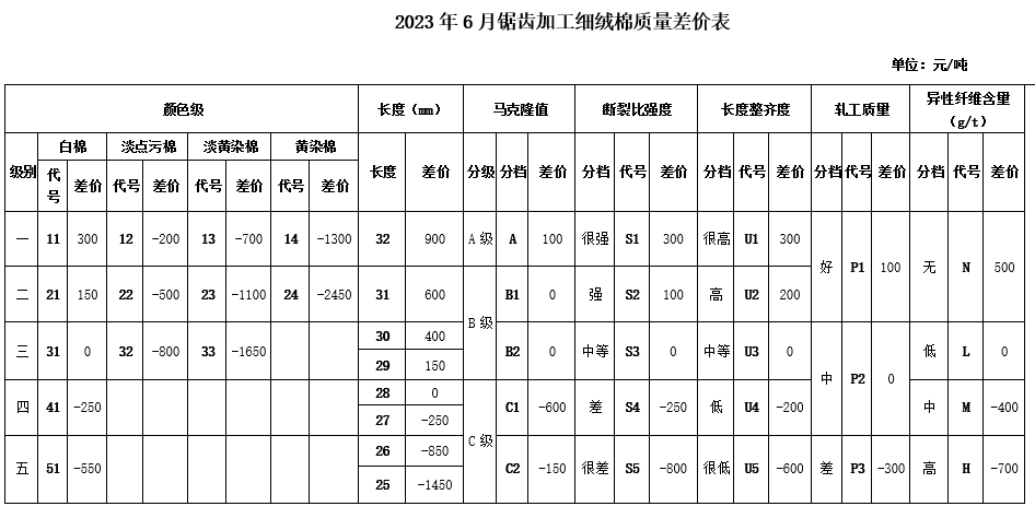 根據(jù)《中國棉花協(xié)會國產(chǎn)棉質(zhì)量差價(jià)表管理辦法》規(guī)定,現(xiàn)正式發(fā)布2023年6月《鋸齒加工細(xì)絨棉質(zhì)量差價(jià)表》、《皮輥加工細(xì)絨棉質(zhì)量差價(jià)表》和《長絨棉質(zhì)量差價(jià)表》(單位:元/噸)。