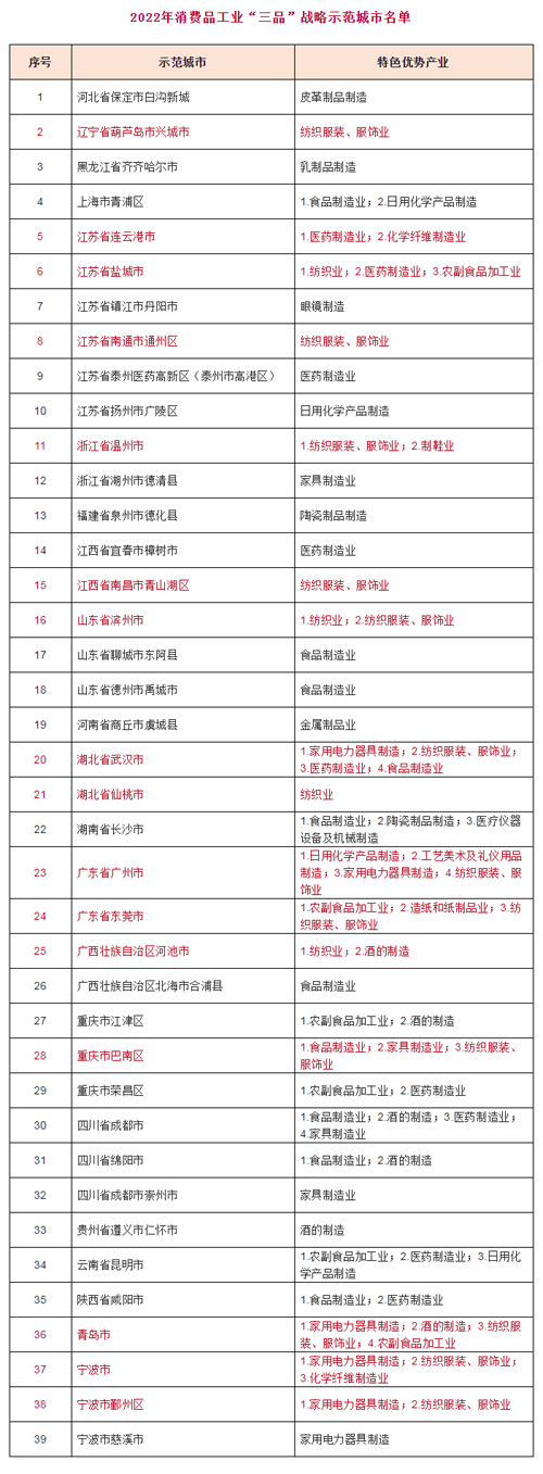 11月30日,工信部消費品工業(yè)司發(fā)布2022年消費品工業(yè)“三品”戰(zhàn)略示范城市公示名單,39個城市上榜,其中包括一批以紡織服裝為特色優(yōu)勢產(chǎn)業(yè)的城市。