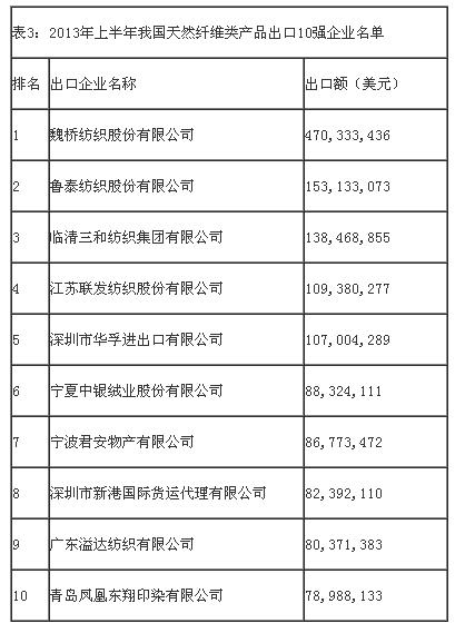 從出口企業(yè)情況來看,我國天然纖維類產(chǎn)品出口集中度較低,出口額排名前10位企業(yè)出口額合計(jì)占同期出口總額的14.5%。天然纖維類產(chǎn)品出口10強(qiáng)企業(yè)名單如表3: