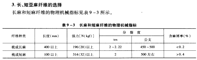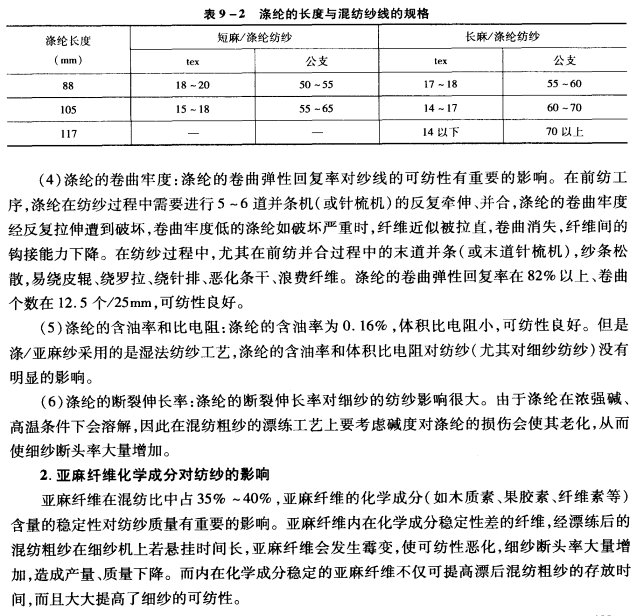 (3)滌綸的線密度:滌綸的線密度和亞麻纖維漂練后的線密度應(yīng)相近。亞麻纖維漂練后的線密度為5—6.67dtex(1500—2000公支)左右,可選用2.78—3.33dtex(2.5—3旦)滌綸和亞麻纖維混紡化纖織物,選用2.78—3.33dtex(2.5—3旦)滌綸對提高成紗品質(zhì)有明顯的效果。滌綸的長度和混紡化纖織物紡紗線的規(guī)格見表9—2所示。