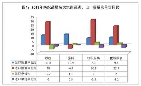 隨著紡織半成品自給化程度的逐步提升,紡織品在進(jìn)口中所占比重逐年縮減。2013年,紡織品進(jìn)口216.7億美元,占進(jìn)口總額的80.3%,占比較2012年下降1.2個(gè)百分點(diǎn)。紡織品進(jìn)口增長(zhǎng)8.7%,其中主要是由紗線增長(zhǎng)25.4%帶動(dòng),制成品僅增長(zhǎng)3.5%,而面料下降4.1%。隨著國(guó)內(nèi)勞動(dòng)力成本的不斷提升,服裝進(jìn)口的比重逐年遞增。2013年,服裝累計(jì)進(jìn)口53.2億美元,占進(jìn)口總額的19.7%,其中以針織、梭織服裝為主。服裝進(jìn)口增長(zhǎng)17.7%,其中針織、梭織服裝合計(jì)增長(zhǎng)21.4%,進(jìn)口平均單價(jià)下降4.8%。